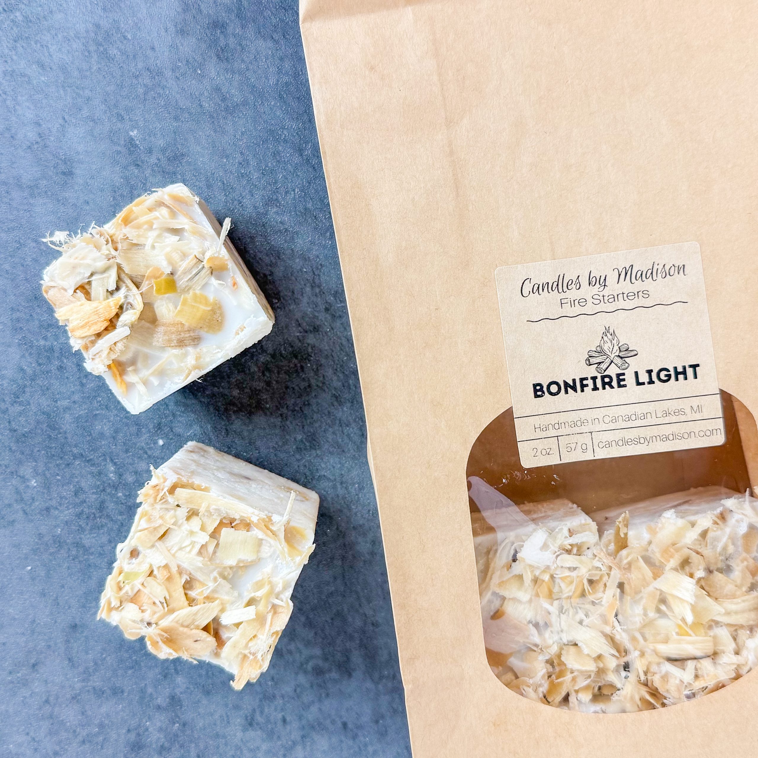 All of our products are hand-poured with love in small batches.  Made from compressed wood shavings, soy wax, and fragrance oil. Each bag comes with 6 fire starter squares.